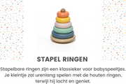 Stapel RingenStapelbare ringen zijn een klassieker voor babyspeeltjes. Je kleintje zal urenlang spelen met de houten ringen, terwijl hij lacht en geniet. |