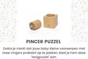 Pincer puzzelIn deze fase leert jouw baby kleine voorwerpen vast te pakken met zijn duim en wijsvinger - dit wordt een pincetgreep genoemd. Zodra je merkt dat je baby met twee vingers kleine voorwerpen probeert te grijpen, bied je hem de pincetpuzzel aan. |