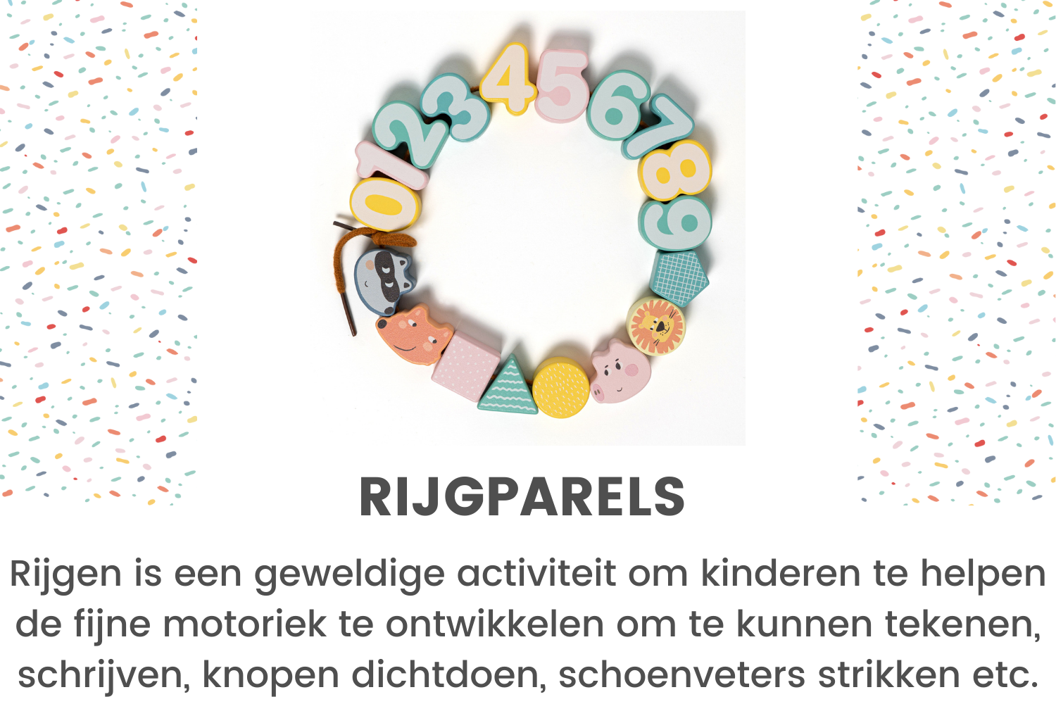 RijgparelsJe peuter ontwikkelt fijne motoriek door aan de verschillende onderdelen van de ketting te trekken en daarbij de cijfers te leren. Een perfect allround speelgoed!