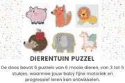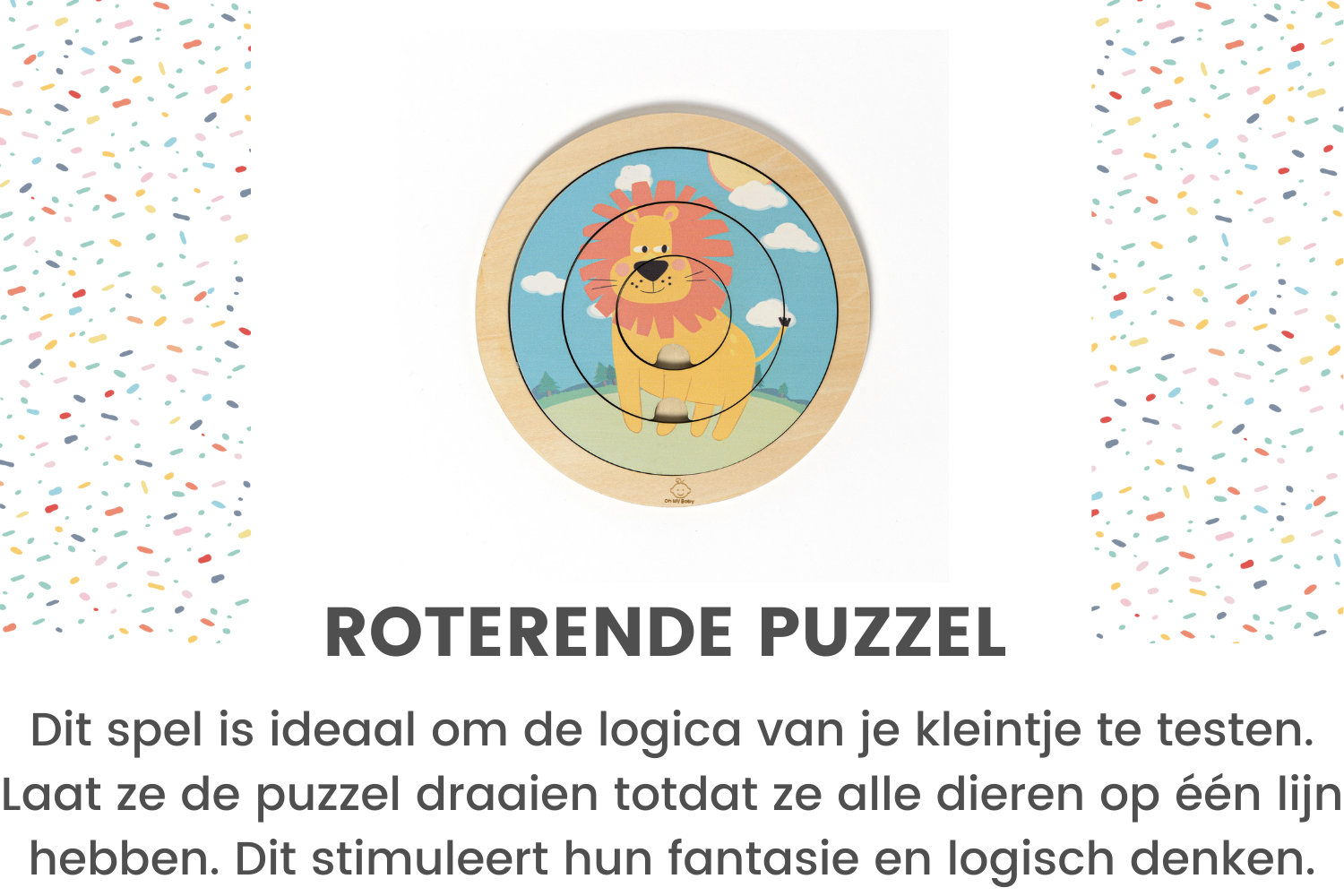 Roterende PuzzelDe puzzeldieren willen weer compleet zijn! De kleintjes moeten de delen van het lichaam van elk dier zoeken en vinden en deze samenvoegen in deze roterende puzzel.